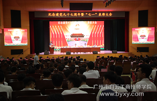 6月29日,广州市白云工商技师学院党委在多功能礼堂隆重举行纪念中国共产党建党97周年暨“七一”表彰大会。会上,来自经济管理系的吴家彬等26名同学,以及来自艺术设计与建筑系的钟晓婷等30名同学,光荣加入中国共产党,分别成为一名正式党员和预备党员。