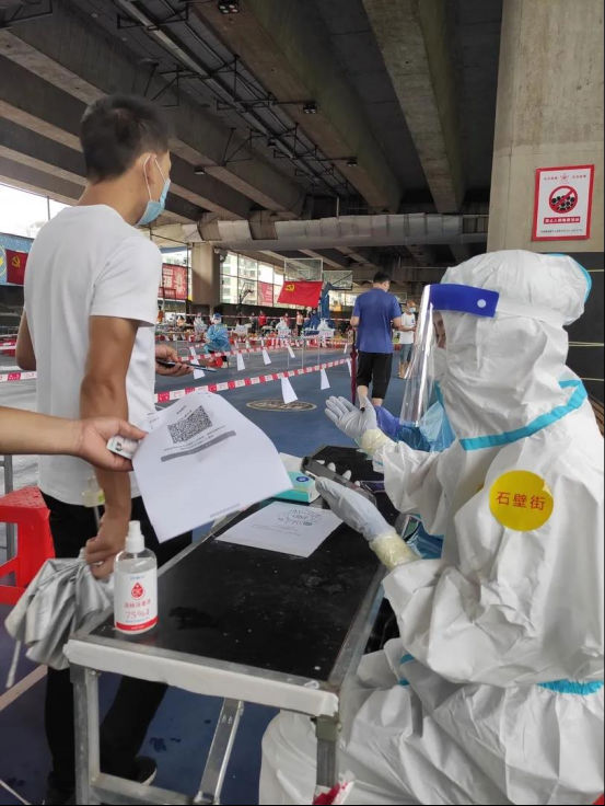 6月20日晚,广州青年防疫应急志愿者储备队发出紧急通知,天河区需要大量志愿者,配合街道连夜开展核酸检测工作,陈慧收到通知立即动身前往支援,到达天河区已是晚上11点,陈慧充分发挥出自己的运动特长,负责起了维持秩序和现场引导的工作,在整个检测点忙前跑后,不知疲倦,结束完支援任务后,天空已经泛起鱼肚白。