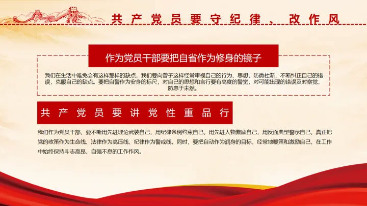 我们作为党员干部,要不断用先进理论武装自己,用纪律条例约束自己,用先进人物激励自己,用反面典型警示自己,真正把党的政策作为生命线、法律作为高压线、纪律作为警戒线。同时,要把自动作为润身的目标,经常地鞭策和激励自己,在工作中始终保持斗志高昂、自强不息的工作作风。