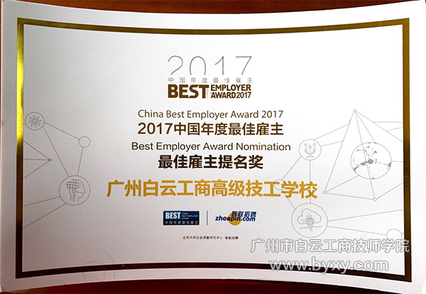 日前,由智联招聘联合北京大学社会调查研究中心共同发起的中国年度最佳雇主评选结果揭晓。广州市白云工商技师学院作为中国民办职业教育的排头兵,获得了“2017中国年度最佳雇主”提名奖。