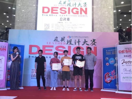 教师伏邦国(右一)与皮具设计大赛获奖学子合影
