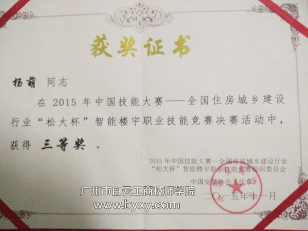 获得荣誉:2015年中国技能大赛——全国智能楼宇职业技能大赛学生组二等奖