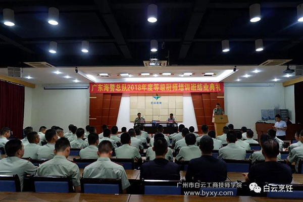 8月30日,广东海警总队2018年度等级厨师培训班的近60名学员,通过在广州市白云工商技师学院为期一个月的学习后圆满结业。广东海警总队军需卫生处首长沙伟骏和吕礼健,广州市白云工商技师学院相关部门负责人出席结业典礼并为优秀学员颁发荣誉证书。