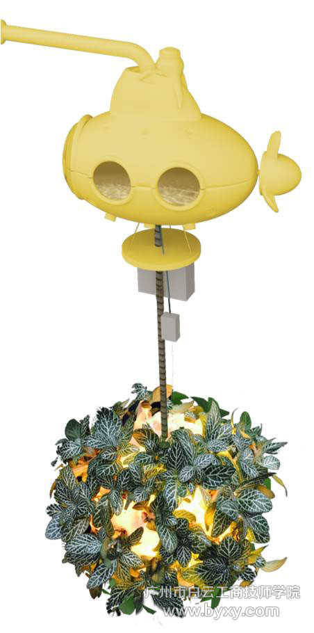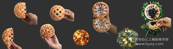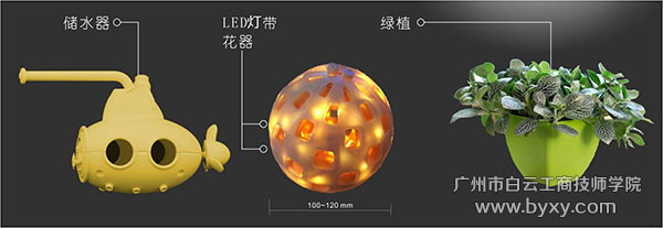 《智造花器(生态小夜灯)》是艺术设计与建筑系教师陈嘉锶、高楚轩、刘哲群、黎嘉琪、方泽伟设计的,主要由几何形态(球体、椎体、特殊定制体等)的花器(100mm~120mm)、led灯(遥控设备)、医用弹力网、输液管装置、小株植物(80mm左右)、特殊营养土等组成。