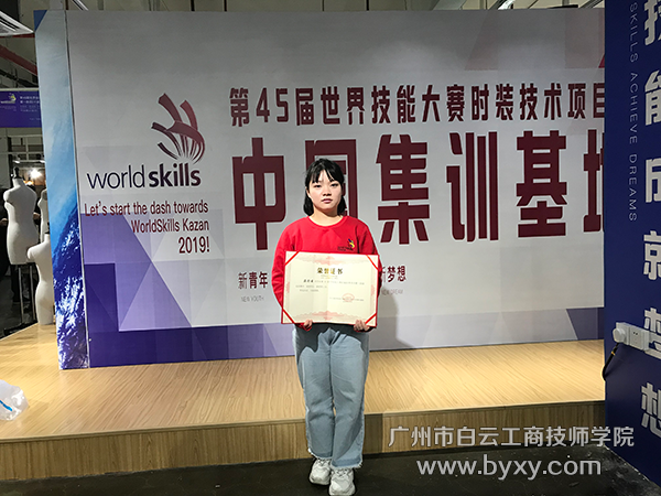 今年6月,代表广东省参加第45届世界技能大赛时装技术项目全国选拔赛的温彩云同学,在与来自各省、自治区、直辖市及新疆生产建设兵团、行业组织、中央企业的数百名时装技术高手的激烈比拼中,以其精湛的技艺和沉着冷静的心态,一举夺得第一名,从而取得了第45届世界技能大赛时装技术项目国家集训队的入场券。