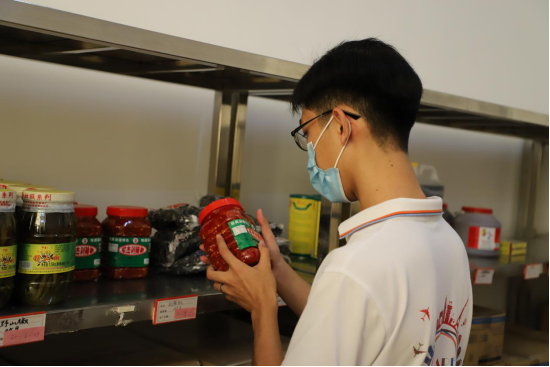 所有食材都在保质期内,确保学生的饭菜安全健康。食堂负责人引领同学们参观了食材储备库及仓库,同学们查看着产品的生产日期及产品的其它重要信息,“都在保质期内,而且生产日期都还比较新。”同学们继续查看食用油、酱油、米、面粉等调料及食材,均是良好。食堂负责人还向同学们展示了各类食材的采购记录、食堂工作人员的每日晨检记录、餐具消毒记录等食堂各项安全管理工作记录,把好每一道关,守护好师生们“舌尖上的安全”。