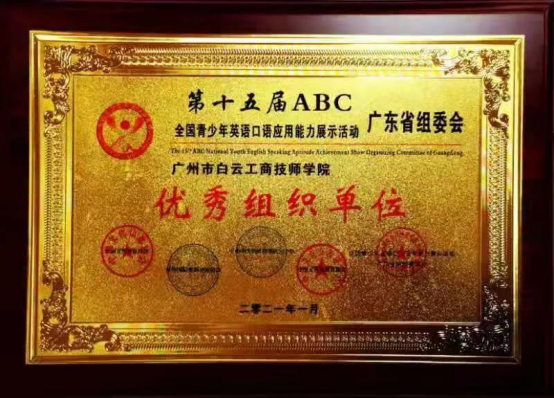 近日,第十五届“ABC”青少年英语口语广东省级决赛正式落下帷幕,广州市白云工商技师学院学子取得2个金牌、2个银牌、1个铜牌和11个优胜奖的优异成绩,同时,我院还得到广东省组委会授予“优秀组织单位”,以表彰我院在此次活动中所作的突出贡献。
