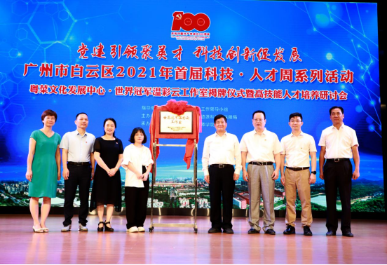 广州市人力资源和社会保障局副局长何士林,白云区副区长卢绮文、白云区组织部副部长黄树峰、白云区人力资源和社会保障局局长张鸣钢、江高镇政府副镇长苏小珍,与我院董事长谢可滔、院长李孟强一起为“温彩云工作室”揭牌。