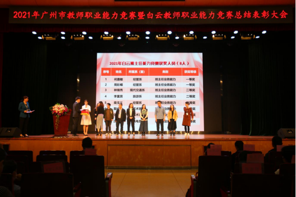 据统计,报送的40个项目,共计有34个项目获奖,获奖率达85%。上报了24份教学设计文本,获奖23份,获奖率为96%;其中一等奖3名,二等奖8名,三等奖12名。说课答辩竞赛上报16名选手,获奖11名,获奖率为69%;其中一等奖2名,二等奖5名,三等奖4名。总体获奖率比广州市设奖比例60% 高出25%。与广州市其他6所公立技师学院相比,获奖数量全市排名与广州市技师学院并列第一。获广州市总工会颁发的金奖1名,银奖3名,铜奖5名,居广州市技师学院前列。现代交通系黄洁琼老师、艺术设计与建筑系柯璧老师、经济管理系赵露玲老师荣获“广州市教学能手”荣誉称号;艺术设计与建筑系殷成志、经济管理系林锦秀、周彩蝶获得“广州市班主任业务能手”荣誉称号,学校被评为2021年广州市技工院校教师职业能力竞赛优秀组织单位。