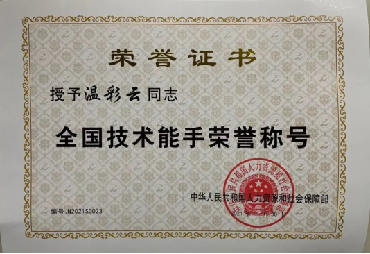 广州市白云工商技师学院温彩云在校期间刻苦努力、学习专业知识,以赛代练,不断提升自己,突破自己,最终在俄罗斯喀山第45届世界技能大赛上,代表中国成功夺取时装技术项目金牌,为祖国摘得一金。并先后获得了“全国青年岗位能手”、“广东青年五四奖章”、“广东省三八红旗手”等荣誉。此次更是被国家人社部授予“全国技术能手”荣誉称号。