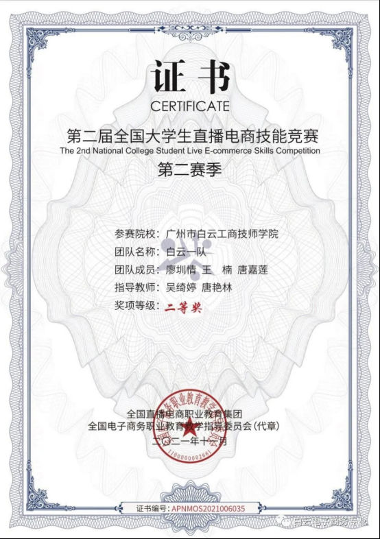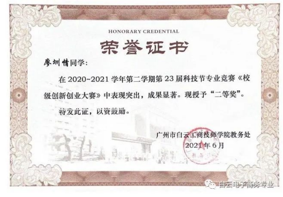 白云工商技师学院电商学院给予了廖圳情同学成长的平台和优质的师资力量。刚开始老师推荐廖圳情同学参加比赛时,她没有信心,觉得能力不够,但在老师们的鼓励和支持下,她大胆的参加了全国大学生直播电商技能竞赛、广东省互联网营销师比赛、校级创新创业大赛等,并取得了优异的成绩。