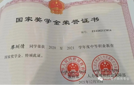 2021年是廖圳情同学成长最快的一年,由于成绩突出(全班排名第一),各方面表现优秀,廖圳情同学被推荐参加国家奖学金的评选,当时她不敢想象,带着“一个技校学生也能评上国家奖学金吗?”的疑问,她忐忑不安的递交了材料,没想到从众多优秀学子之中脱颖而出,最终,廖圳情同学获得了“国家奖学金”。