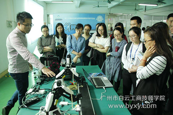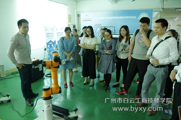 在参观学习的过程中,老师们就企业对大学生的知识技能要求、大学生就业后的事业发展规划以及双方在技术应用型人才培养方面可能开展的合作等问题进行了座谈交流;在随后的参观过程中,广州普华灵动机器人技术有限公司总经理钟工向老师们详细介绍了当前行业技术发展的趋势,并演示了智能机器人设备操作,让在场的老师们大开眼界,纷纷主动向专家咨询相关技术操作问题。